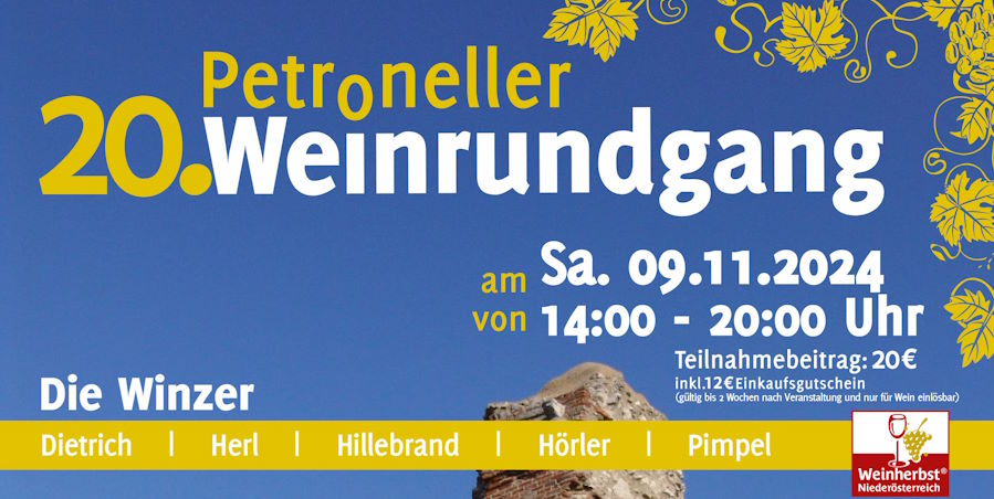 Am 9. November 2024 (Beginn: 14 Uhr) freuen sich die Petroneller Winzer wieder Sie begrüßen zu dürfen.