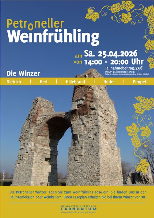 Am Samstag, den 25. April 2026 (Beginn: 14 Uhr) freuen sich die Petroneller Winzer wieder Sie begrüßen zu dürfen.
